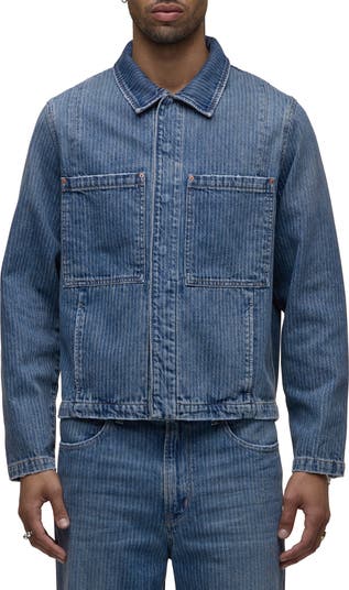 This jacket delivers a refined, sartorial look with indigo-dyed rigid denim with vertical stripes and concealed snaps on the placket and sleeves.