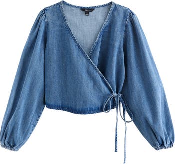 A wrapped front shapes the silhouette of this denim top framed by billowed sleeves and tethered with a dainty side tie.
