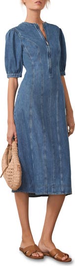 Indigo denim dress in a midi silhouette featuring a crew neckline, short puff sleeves, seam detailing with a zip fastening through the front.