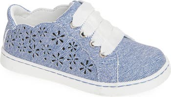 Laser-cut perforations and a scalloped topline bring charming dimension to a sweet denim sneaker set on a cushioned footbed and grippy cupsole.