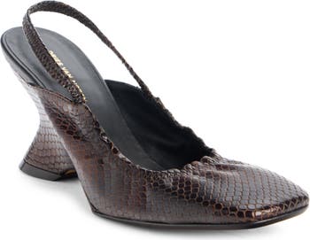 Signature drama lurks in every curve of this sculptural sling pump made of snakeskin-embossed leather and set on an arched wedge heel.