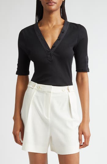 Fine allover ribbing and comfortable stretch enhance the figure-skimming silhouette of this button-half-placket top made from a soft cotton-modal blend.