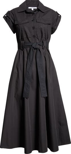 Rolled cuffs and patch pockets dial up the workwear vibes of a breathable cotton shirtdress complete with a matching tie belt.