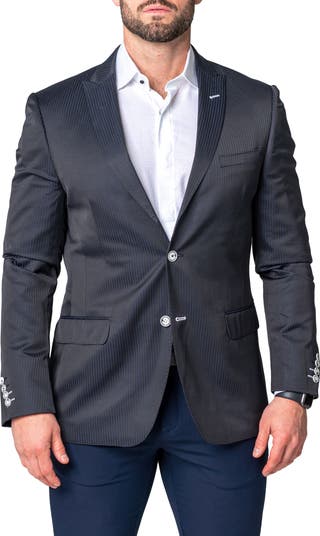 Made from luxe Italian stretch fabric, this single-breasted jacket sports a dark hue and an unstructured profile for a casual feel. Curved, contrasting four-button cuffs and a vividly patterned lining offer a signature touch.