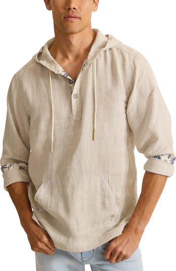 Palm trees peek out from under the placket and cuffs of a breathable all-linen Baja hoodie to wear in a hammock as you enjoy a cold drink and hot novel.