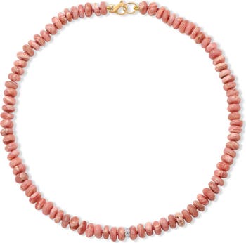 Channel the colors of a desert sunset with this rhodochrosite-beaded necklace centered with a diamond-embellished rondelle accent and shut with a 9-karat yellow-gold clasp.