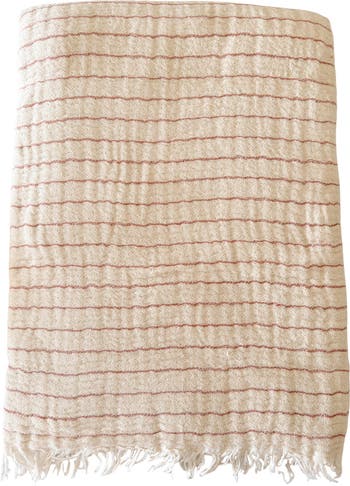 The Desert Red Striped Turkish Cotton Crinkled Throw is made with soft cotton which is naturally breathable. The soft crinkled pattern is mixed with various stripes woven with Beige & Desert Red yarns. This blanket will style effortlessly from season to season and is finished with a self fringe. Color: Desert Red & Beige. Dimensions: 55"x75". Material: 100% Cotton. Made in Turkey. Machine Wash Delicate with like colors. Hang to Dry. No iron.