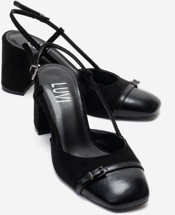 A refined block-heel shoe that pairs architectural lines with subtle luxury