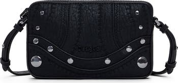 A mix of stitches and studs add Western flair to this faux-leather crossbody bag featuring a slender profile and optional wrist strap for easy on-the-go styling.