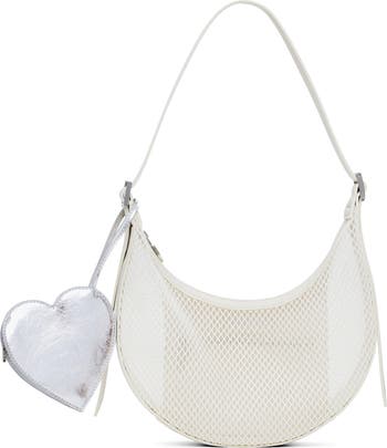 Dare to bare with this fishnet-style baguette bag boasting a Y2K-inspired curved silhouette and metallic heart pouch affixed to the side.
