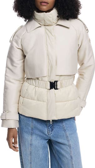 A short belted puffer is topped with trench-style details to create this modern hybrid jacket with cool looks and warming insulation.