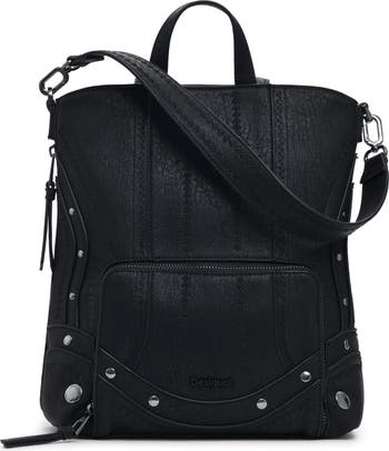 A mix of stitches and studs add Western flair to this faux-leather backpack featuring an optional shoulder strap and zip-around gusset to adjust the capacity.