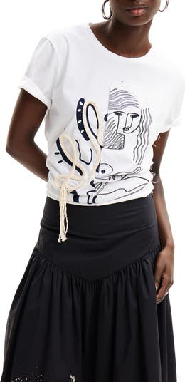 An embroidered modern art graphic gets a trailing rope accent on a cotton T-shirt designed with a few raw seams to further the tactile appeal.