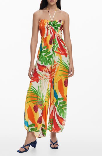 Tropical Print Halter Cover-Up Jumpsuit