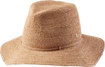 A rollable and packable fedora is hand-crocheted in breezy raffia and fitted with an inner neoprene band for comfort.