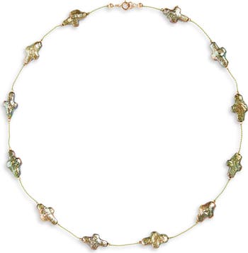 A simple, comfortable-to-wear silk cord is stationed with cross-shaped, peacock-hued freshwater pearls for an improbably understated statement necklace. Each light-catching pearl of this handcrafted piece is spaced with intention, creating a rhythm that feels steady and intimate, evoking the quiet beauty of breath between moments.