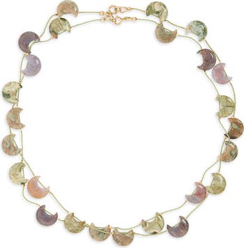 Crescent-shaped stones glow like memories as they orbit this silk cord necklace designed to radiate energy and resilience.