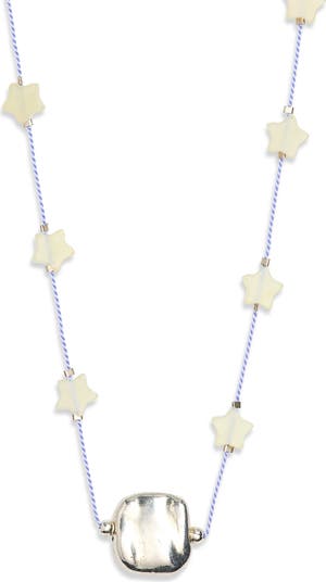Luminous mother-of-pearl stars station the simple silk cord of this celestially inspired necklace centered with a molten square in-line pendant.