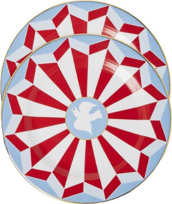 Crafted from the finest Italian porcelain, our Dessert Plates arrive in appropriate high-vibe style, with hand painted 18K gold trims. This geometric set of two in a rich berry and blue palette is inspired by the drama and romance of Italy’s opulent capital, Rome, and features a white peace dove in its centre. Great for a gorgeous gift, these plates do double duty, so snag a few for your salad course or dot around your home as a handy spot for keys or crystals as well.