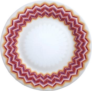 The Missoni Zig Zag collection is a homage to the iconic zigzag stitches that made Missoni's designs instantly recognizable and elevated the brand to global luxury status in the 1960s. Multicolored or self-patterned white, the Zig Zag line is a best-selling line. The range includes dinnerware, flatware, glassware, trays, and scented candles.