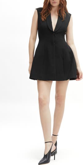 An impeccably flared skirt creates the hourglass silhouette of this sleeveless minidress complete with a smooth shawl collar.
