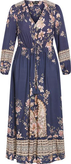 Vintage-inspired florals and ornate border prints bring romantic detail to this maxi dress cinched with a comfortable drawstring waist.