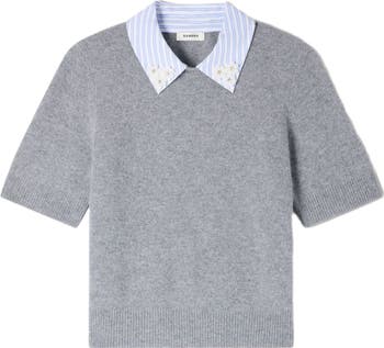 Fine knit sweater with a removable, contrasting, striped and embroidered shirt collar and short sleeves.