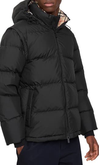 A puffer jacket filled with goose down and insulating fibres, appliquéd with our Knight stamp – an archival motif from the 1980s. Detachable sleeves switch the design from a jacket to a gilet. The style is cut to a relaxed fit and features a Burberry Check wool lining at the detachable hood and collar.||Two-way zip closure|Detachable drawcord hood|Detachable sleeves|Side zip pockets|Drawcord hem|Storm cuffs|Burberry Check lining at hood and collar|Appliquéd Knight stamp at sleeve|Comes with a garment bag