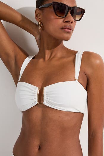 This Karen Millen bikini top combines contemporary design with practical versatility. The standout gold-tone hardware creates a luxurious focal point whilst the detachable straps offer two distinct looks - wear as a classic bandeau for minimal tan lines or attach the straps for additional support during active beach days. The gathered fabric detail adds a touch of sophistication that distinguishes this piece from ordinary swimwear.