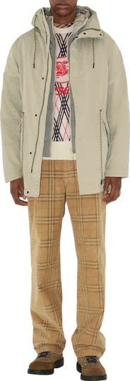 A fishtail parka made from a lightweight double-faced nylon blend twill, cut to a relaxed fit. The sleeve is embroidered with our Knight stamp – an archival motif first seen on Burberry bags in the 1980s. Inside is a detachable puffer jacket, knitted with Burberry Check trims at the hood and cuffs in our signature sand colourway. The pieces can be layered or worn separately for multiple looks.||Parka: press-stud and two-way zip closure, drawcord hood, waist and hem, side press-stud flap pockets, press-stud cuffs, embroidered Equestrian Knight Design at sleeve|Warmer: two-way zip closure, side zip welt pockets|Comes with a garment bag