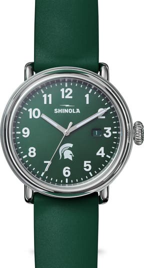 Shinola's boldest, and one of its most beloved watch styles, the Detrola is back in deep green, with a Spartan helmet silhouetted above the six, paying tribute to the Detroit brand's (and yours) mighty Michigan State Spartans.