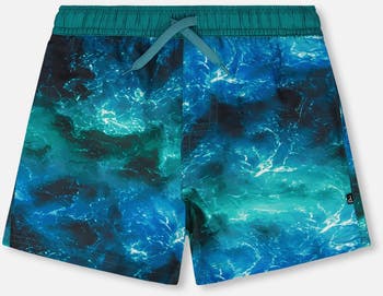 The swim trunks in blue with waves print capture the spirit of the ocean for summer adventures. These above-the-knee swim shorts feature a striking allover wave effect print in rich shades of blue, crafted in lightweight recycled polyester with a breathable mesh lining. An elastic waist with adjustable drawstring ensures a secure and comfortable fit for boys during all-day water play.