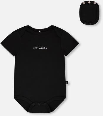 Fresh and simple, this evolutive organic cotton jersey "mister zebra" bodysuit in black is perfect for everyday adventures. The bodysuit features short sleeves, and a playful message on the chest for a touch of character. Finished with an envelope neckline and bottom snap closures, it’s designed for easy dressing and quick changes. The leg snap button closure is evolutive to adapt as he grows.
