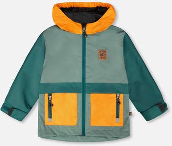 Our recycled polyester mid-season jacket in dark green and orange adds a touch of adventure to rainy spring days. Waterproof and fluorocarbon-free, this colorblock jacket features a BIONIC-FINISH® ECO coating, a soft jersey lining, and taped seams at critical points for maximum protection. Designed with zip side pockets, adjustable Velcro® cuffs, and a high-quality YKK® zipper, it keeps boys cozy, dry, and stylish in every fluttering adventure.