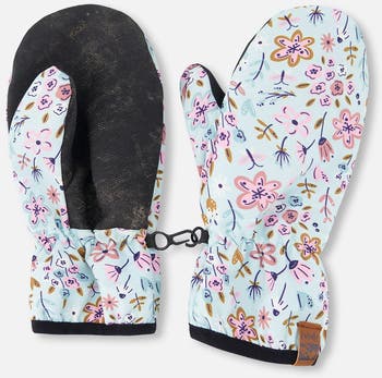 Our recycled polyester mid-season mittens in blue with mini flower print are perfect for cool and damp days. Waterproof and fluorocarbon-free, they feature an eco-friendly BIONIC-FINISH® ECO coating that repels water and dirt without harmful chemicals. Made from recycled plastic bottles and lined in soft polyester, these mittens keep little hands dry, comfortable, and ready for outdoor fun.