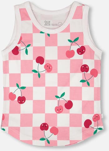 This organic cotton jersey tank top in pink with printed cherries is a sweet essential for sunny days. The sleeveless tee with a round neckline is finished with an allover checker and cherry print for a playful accent. Made in organic cotton jersey with added stretch, it is soft, breathable, and comfortable for everyday wear.