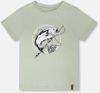 The organic cotton jersey t-shirt with print in sage is a cool and modern piece for boys. This short-sleeve tee features a round neckline and a graphic on the chest of a fish with a fishing line, giving it a playful and contemporary touch. Crafted from soft organic cotton with a hint of stretch, it ensures comfort and breathability all day long as part of our “B.O.Y.S.” collection.