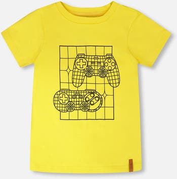 The organic cotton jersey t-shirt with gamer print yellow is a cool and playful piece for boys. This short-sleeve tee showcases a black line graphic of video game controllers across the chest, giving it a trendy gamer-inspired vibe. Made from soft organic cotton with a hint of elastane, it ensures breathable comfort and flexibility for everyday fun.