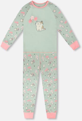 Cuteness overload is guaranteed with this two-piece pyjama set in a playful green kitten print. This set features a long-sleeve top with an adorable kitten holding a pink flower pairing perfectly with the matching pants covered in tiny kittens and blossoms, finished with pink fitted cuffs for extra charm. Made from soft organic cotton, this “Starry Night” collection set is as cozy as it is sweet, perfect for happy dreams.