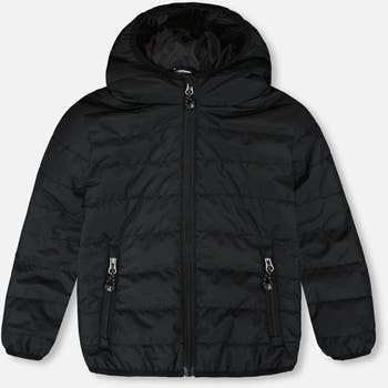 Our quilted polyester mid-season jacket in black combines warmth, practicality, and everyday style. Designed with horizontal quilting and soft insulation, this jacket features a durable fluorocarbon-free BIONIC-FINISH® ECO coating and a 5,000 mm polyurethane waterproof layer for protection against light rain. Complete with zipper pockets and an attached hood, this unisex jacket keeps kids dry, warm, and comfortable in every season.