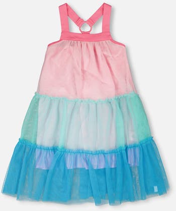 Our mesh dress in pink and blue is a colorful statement piece for festive summer days. This sleeveless A-line dress features crisscross straps at the back, tiered layers, and a flared hem for twirl-worthy movement. Crafted from soft cotton with spandex and finished with airy mesh and a full polyester lining, it’s a standout choice from our "Blue Horizon" collection.