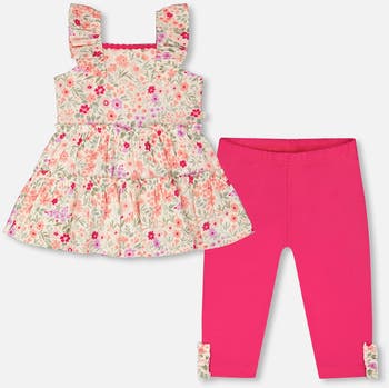 Our tunic and capri set off white with printed flowers and pink is a delightful mix of charm and comfort. The sleeveless A-line tunic features flutter ruffles at the shoulders, and tiered flounces with an allover floral print in soft meadow hues. Paired with pink organic cotton capri leggings finished with little ruffles at the hem, this set is perfect for girls and baby girls to enjoy sunny adventures.