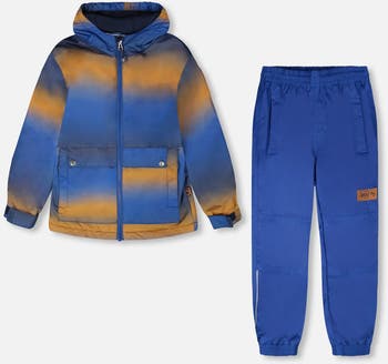 Fun and functional, this two-piece mid-season outerwear set in blue and brown gradient keeps boys warm and dry through all their outdoor adventures. Featuring an outer jacket with a polar fleece lining and matching jersey-lined pants, the set combines comfort, durability, and eco-friendly protection. The recycled fabric is treated with a fluorocarbon-free BIONIC-FINISH® ECO coating, making it water- and dirt-repellent while maintaining breathability for all-day play.