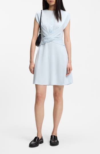 A crisscrossing front wrap detail both obscures and underscores the keyhole slit at the neckline on this pastel dress cut from a lightweight, stretchy knit.