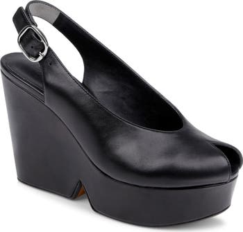 Bring an extra bit of drama to your look with this lofty platform wedge sandal complete with a slingback strap.