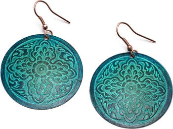 Bold, floral disc earrings with a bold teal patina finish on brass for a look evocative of an ancient Indian garden.