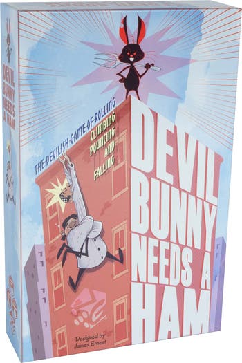 DEVIL BUNNY NEEDS A HAM - Can you get to the top in time?! Originally sold in the yesteryear of the 1990s, Devil Bunny is back with a box edition, tangible components, and a snazzy-and-highly-detailed figure — featuring his ham getting fork, of course! Get your climbing shoes and your sous-chef hats read! In this racing adventure game of rolling, pouncing, and falling, you and your sous-chef friends are trying to climb to the top of a skyscraper in a race to safety at the top! But beware… The dastardly Devil Bunny is trying to knock you down to the ground because who doesn’t want to fight dirty for a delicious ham? You’ve got a little bit of luck on your side as you work only lose a climber after The Ledge of Death and Devil Bunny avoids some seriously scary foes like alfalfa, bugs, grease, the weasel, and more bugs! Get to the top and claim the ham before Devil Bunny and other sous-chefs beat you to it!