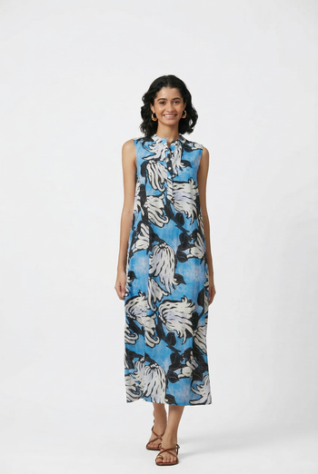 Effortless and fluid, this sleeveless midi dress features a clean silhouette with bold print and easy movement.