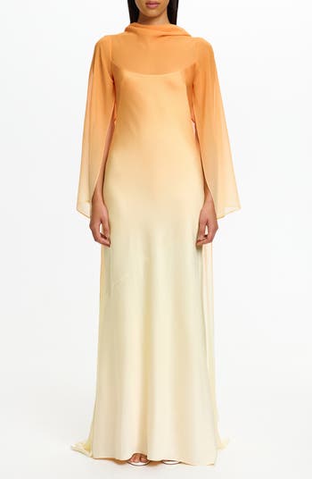 Sunset shades define a captivating gown made from a mix of airy georgette and glossy satin. An open back adds allure to your exit.