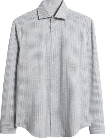 A geometric grid pattern styles this smart sport shirt, cut from smooth, stretchy, wrinkle‑resistant OoohCotton fabric designed to wick moisture, dry quickly, and keep you comfortable all day. Genuine mother‑of‑pearl buttons enhance the polished look, while the curved hem looks great tucked or untucked.